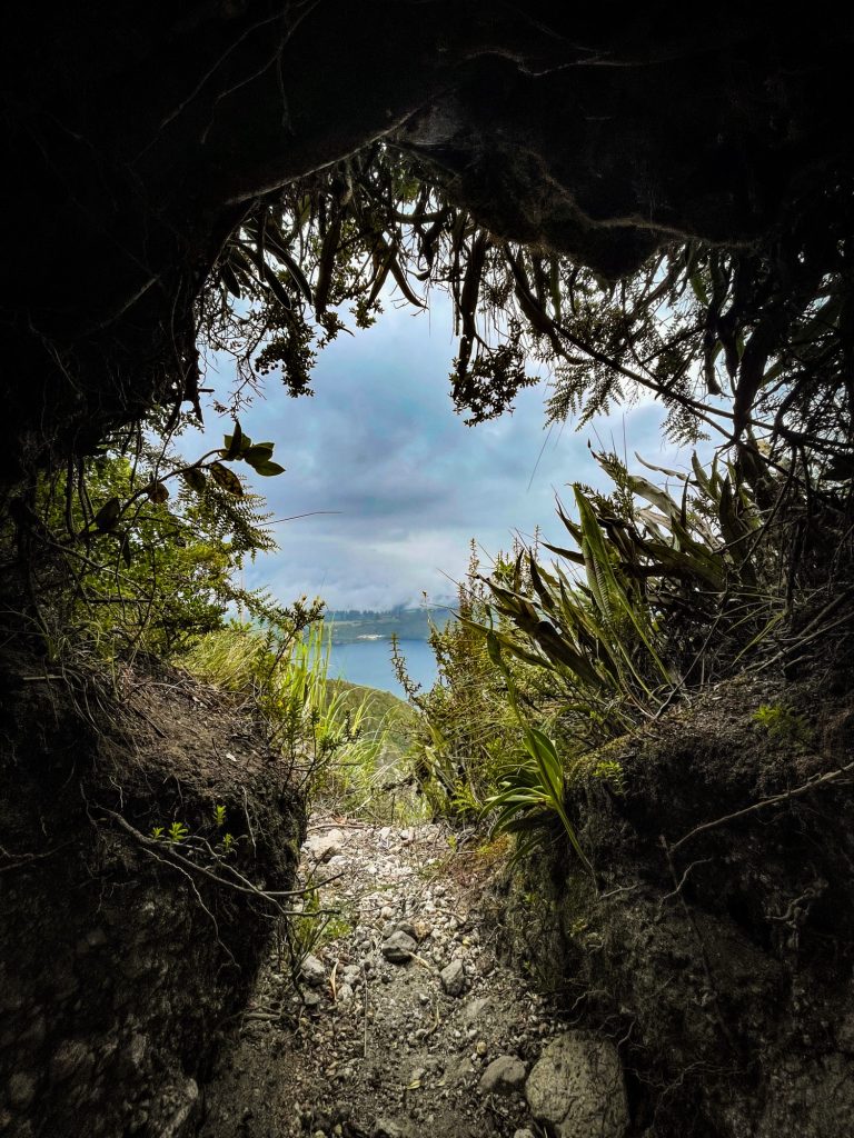 Die Strecke führte dann zurück zum Kamm, noch ein Stück rauf und dann waren wir schon am höchsten Punkt der Wanderung angelangt. Dort wartete ein kleiner Pavillon mit Bänken, hier pausierten wir und ich aß das erste meiner belegten Brote. Es fühlte sich schon sehr deutsch an, aber über die bisherige Reise hatte sich ein gewisser Stolz in mir entwickelt. Deutsche sind im Ausland als freundliche, hilfsbereite, kluge und anpackende Menschen bekannt und der Ruf gefiel mir. Ich stand auf und ging zum Aussichtspunkt, die Lagune ist wirklich ein kräftiger und wunderschöner Ort. Wir standen zu viert, schauten herab und sprachen wenig. Dann geschah etwas unglaubliches.