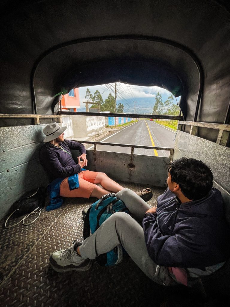 Ich packte meinen Rucksack und schnürte meine Stiefel fest, es konnte losgehen. Wir gingen zum Bus-Terminal im Ort und spähten einen Bus aus, der in die Richtung fahren sollte. Wir trafen noch Jorge, einen guten Freund von Uli, er schloss sich an. Dann wurden wir von einem enthusiastischen Fahrer angesprochen, sein Fahrzeug: ein Pickup mit überdachter Ladefläche. Neben Taxis und Bussen eines der üblichen Personentransporter hier. Er würde uns vier direkt zum Nationalpark fahren, für schlappe 6,- $. Wir stimmten zu und nahmen auf der Ladefläche, die man bestenfalls als unbequem beschreiben kann, Platz. Doch aufregend war es dennoch, ein weiteres No-Go in Deutschland auszuprobieren.
