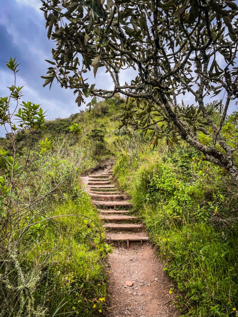 Der Wagen fuhr an den Hängen des Cotacachi hoch und hielt an der Passkontrolle. So ziemlich jeder Nationalpark in Südamerika darf nur nach einer Personenerfassung betreten werden, manche von ihnen kosten sogar Geld. Wir durften passieren, besuchten noch einmal das stille Örtchen und dann ging es los. Zunächst ein paar Stufen zur ersten Anhöhe. Die Vegetation bestand aus vielfältigen stacheligen Büschen, Moos und Blumen.