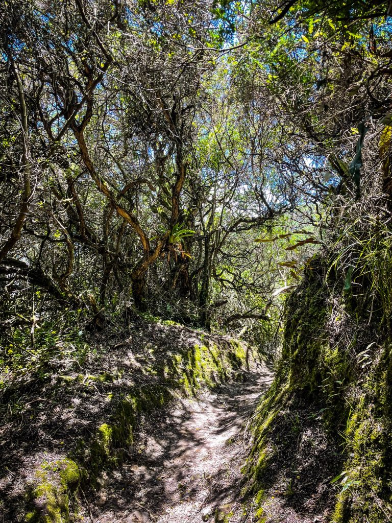 Der Weg wanderte sich sehr angenehm. Ansteigende und ebene Abschnitte wechselten sich ab, so wurde es nicht zu anstrengend und es benötigte keine Pausen. Ich konnte wieder wunderbar in Meditation und eins mit der Welt um mich herum sein. Ich spürte, wie mein Körper nach der Nahtoderfahrung in Machu Picchu Maßnahmen ergriffen hatte, auf solche Anstrengungen besser vorbereitet zu sein. Ich konnte die Pflanzen am Wegesrand bestaunen und das Aktivsein genießen. Der Wille meines eingerosteten Körpers war gebrochen worden, er gehorchte.