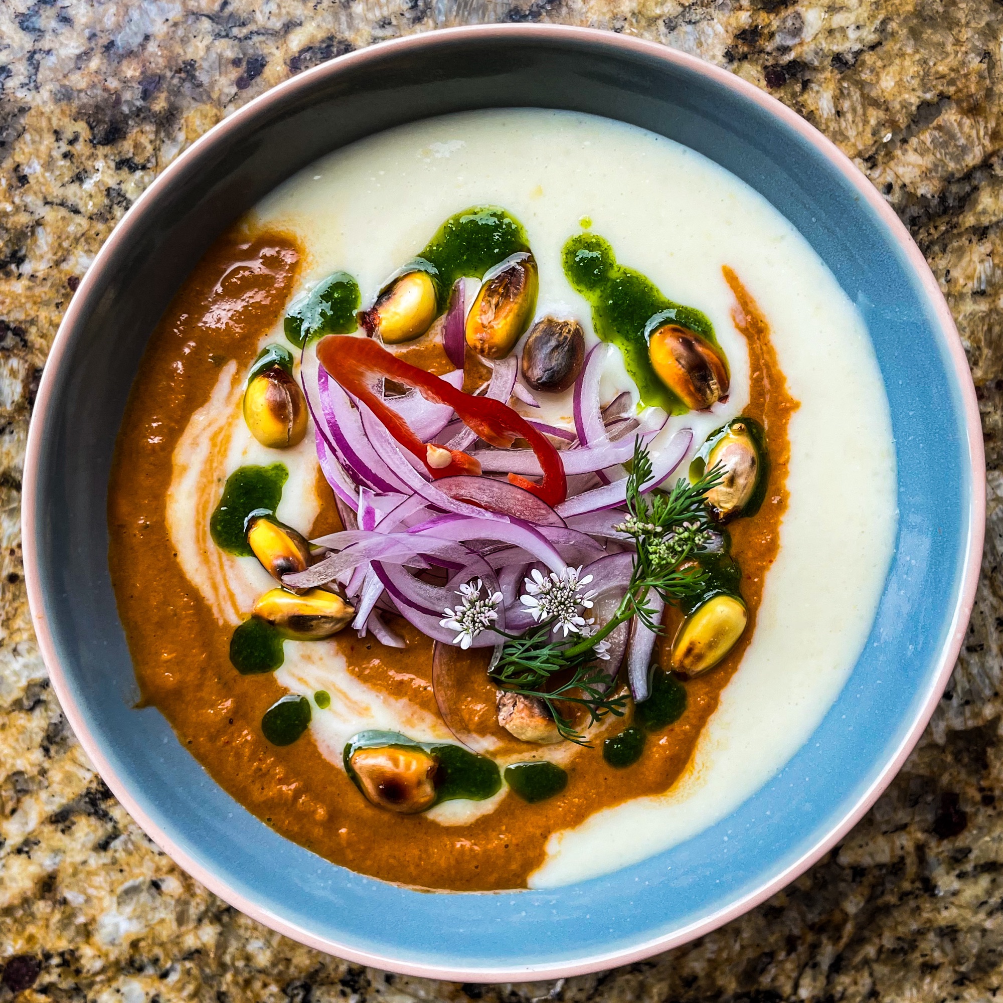 Diese Vorspeise habe ich mir in Cotacachi, Ecuador ausgedacht. Dort wird als Streetfood oft Choclo con Queso gegessen. Ein gegarter Maiskolben mit einer Art zerbröseltem Hirtenkäse. Manchmal wird dazu Aji, eine scharfe Sauce gereicht. Es sättigt und der Mais in Südamerika schmeckt einfach unglaublich gut. Ich hatte die Idee, aus diesem Streetfood eine Suppe zu machen und in einer Liaison mit einer Gazpacho zu reichen. Die milde cremige Maissuppe und die würzige Gazpacho gleichen sich hervorragend aus und sind ein absoluter Hingucker auf dem Tisch.